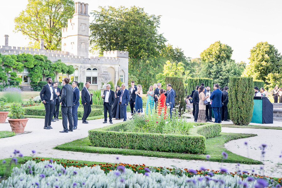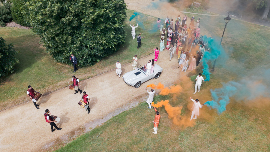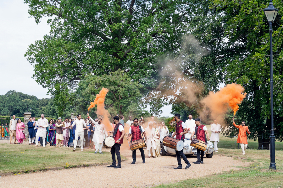 The day began with Veeral’s Baraat, the groom’s traditional arrival, led by powerful Dhol drummers and a sea of dancing guests. With music, movement, and dramatic flares cutting through the summer heat, the procession was energetic — an explosive start that filled the Ashridge grounds with sound and colour.