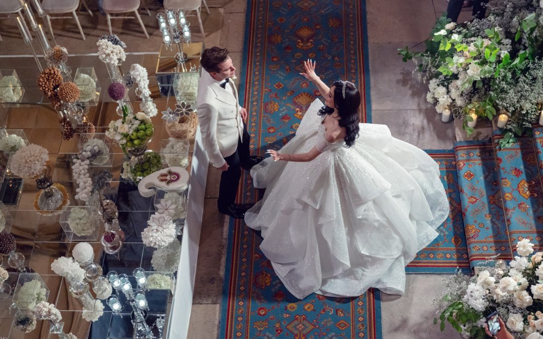 A bride in a voluminous white gown gestures while facing a groom in a white tuxedo jacket. They stand on a patterned blue carpet, surrounded by flowers and elegant decorations, viewed from above.