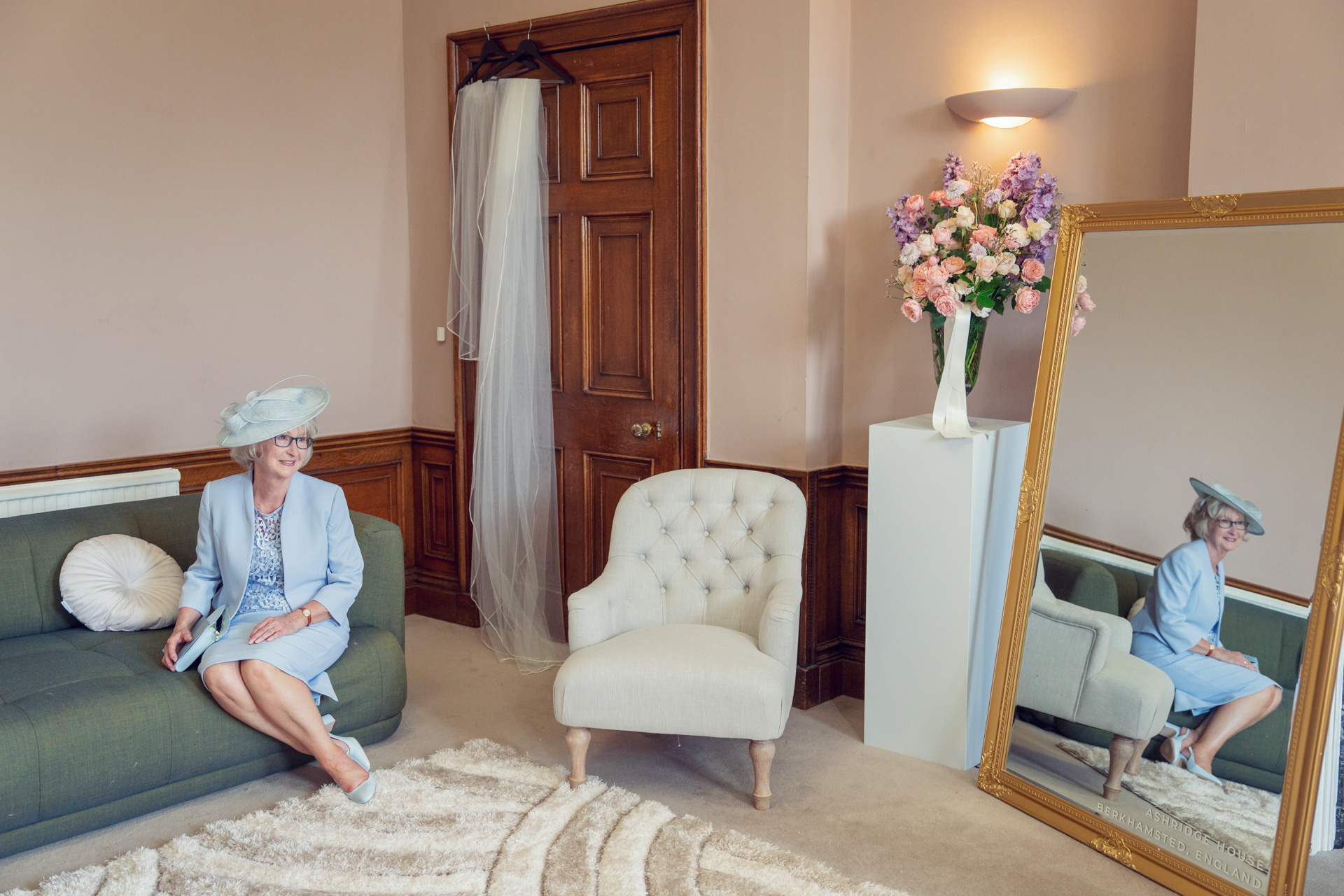A woman in a pale blue outfit and hat sits smiling on a green sofa in an elegant room, with a large mirror reflecting her image, a vase of flowers, and a white chair nearby. A veil hangs on a wooden door.