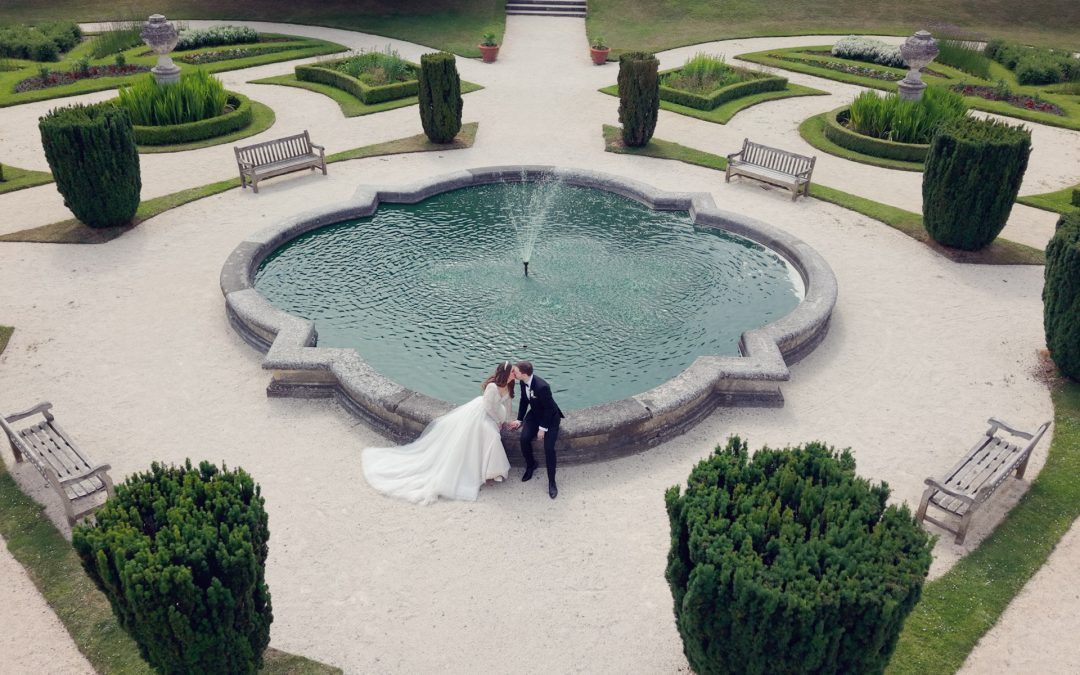 A bride and groom sit beside a decorative fountain in a landscaped garden, sharing a kiss. The scene is viewed from above, showing symmetrical pathways, benches, and manicured greenery surrounding the fountain.
