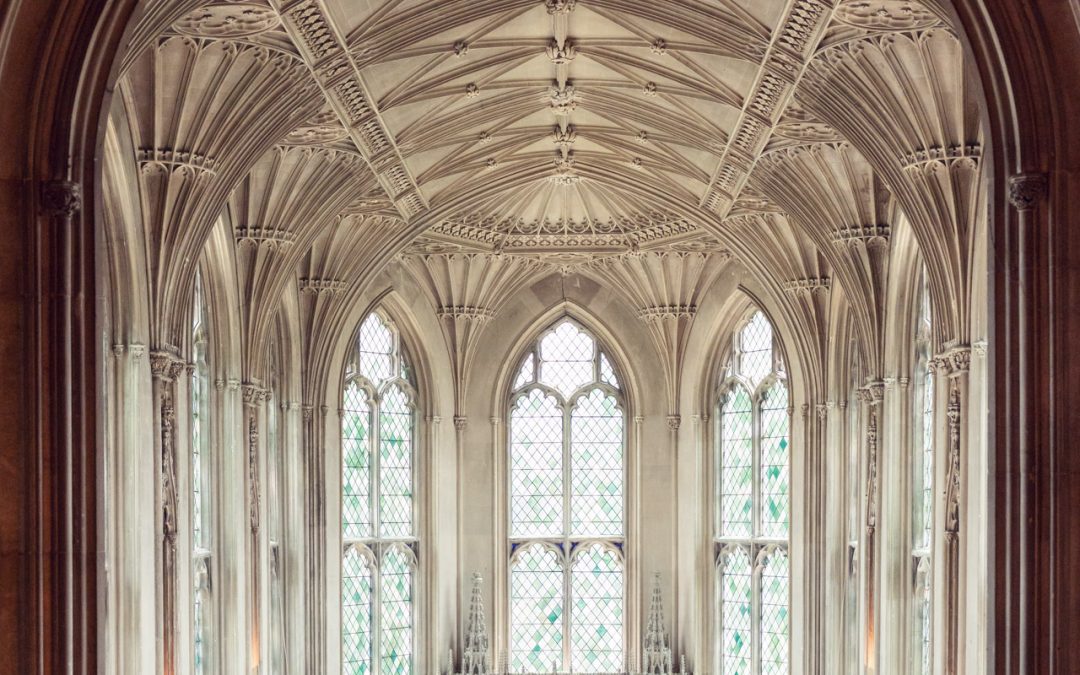 A bride and groom stand at the altar in a grand, ornate chapel with high vaulted ceilings and large stained glass windows, surrounded by seated guests during their wedding ceremony.