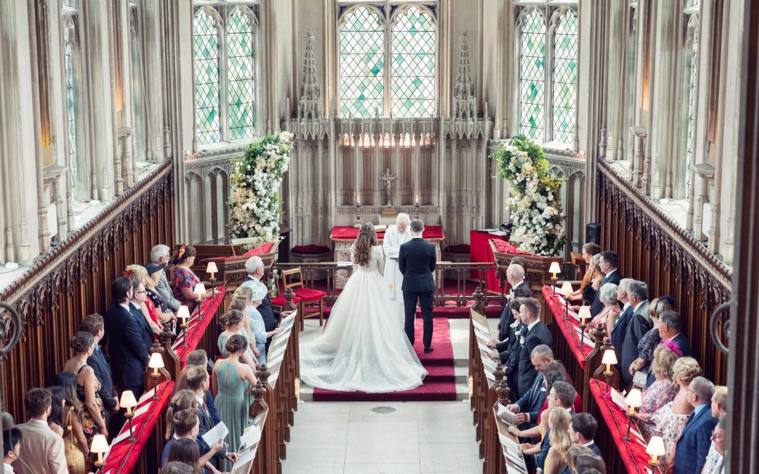 A bride and groom stand at the altar in a grand church with stained glass windows, surrounded by seated guests on both sides, during a wedding ceremony.
