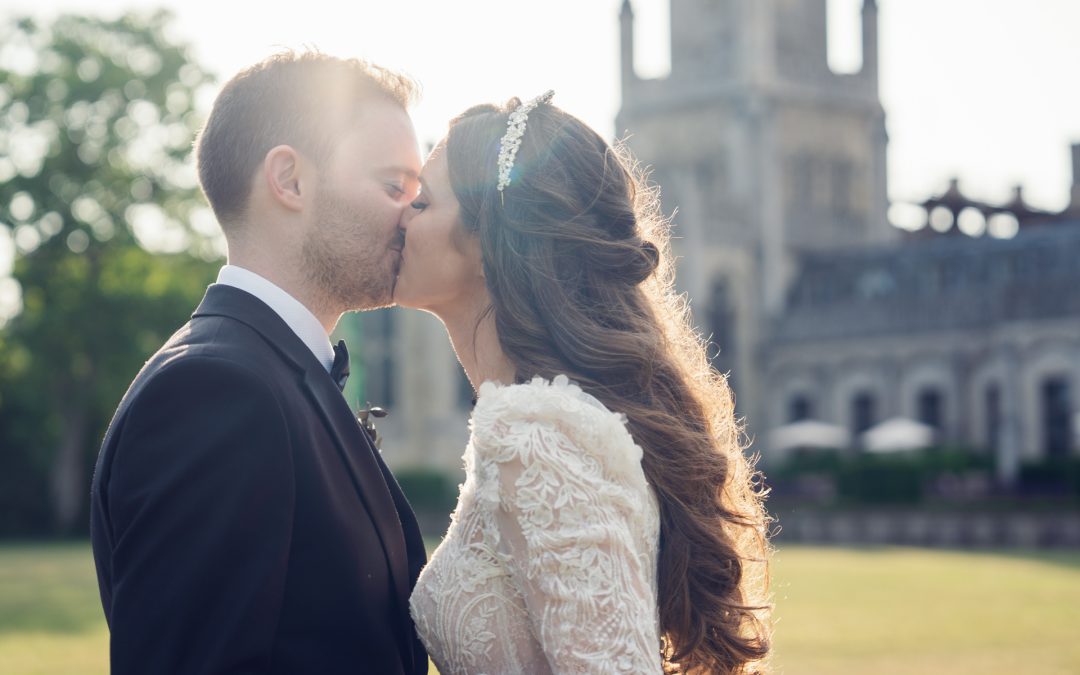 A bride in a white lace dress and groom in a black suit share a kiss outdoors, with sunlight shining behind them and a historic stone building in the background.