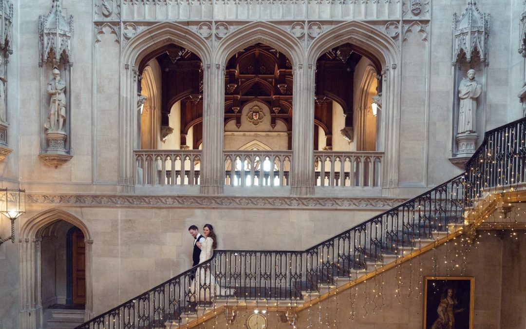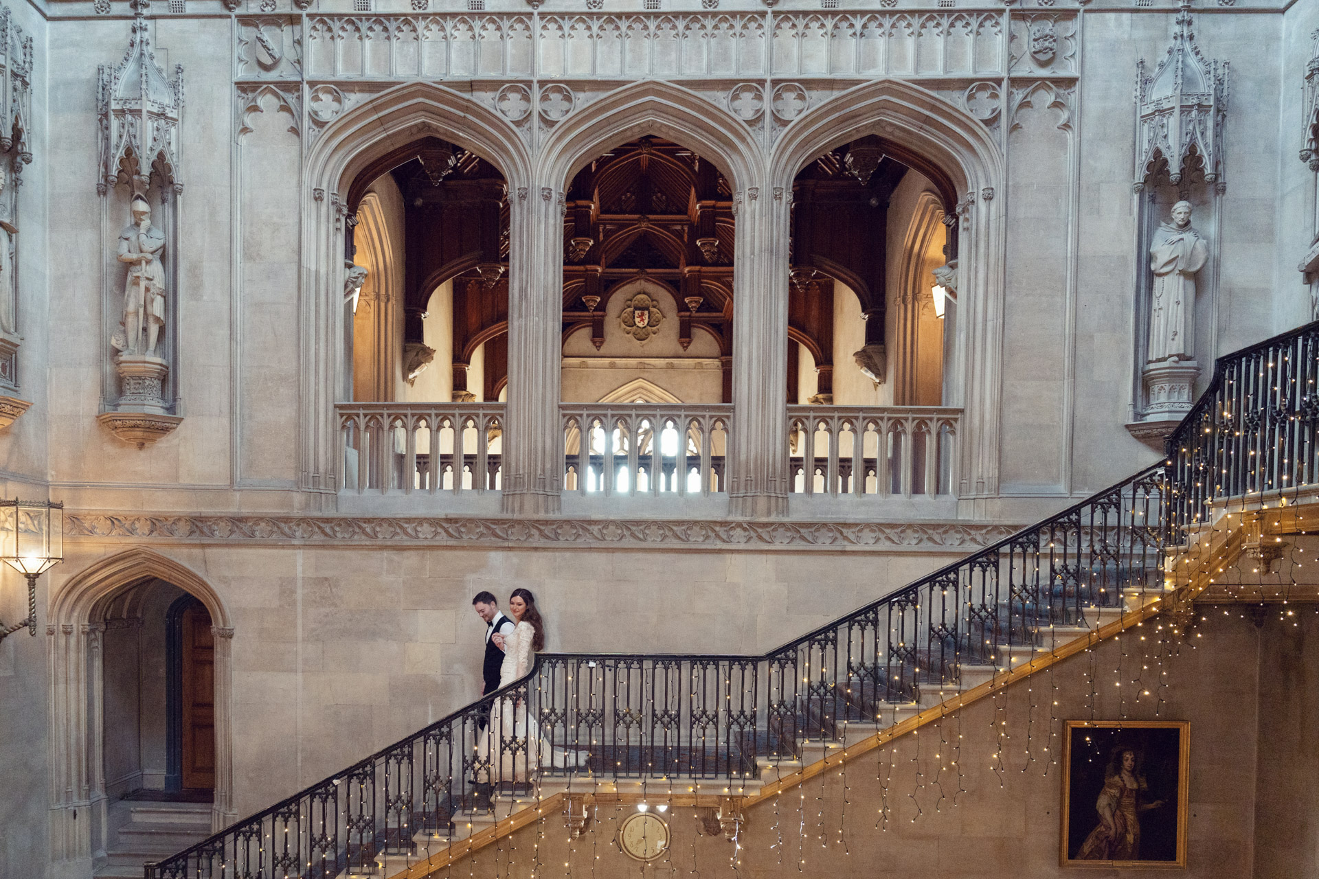 A couple in formal attire walks up an ornate stone staircase decorated with fairy lights inside a grand, historic building with arched windows, statues, and detailed carvings.