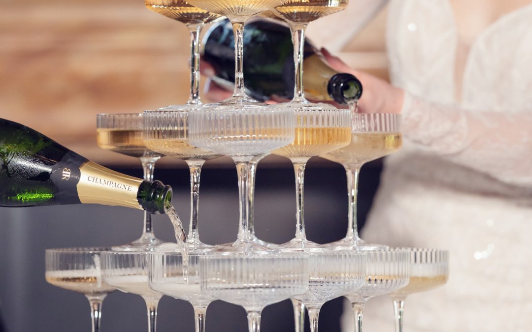 A bride in a white dress pours champagne into the top glass of a multi-level champagne tower, causing it to cascade into the glasses below. Another person is also pouring champagne from a bottle.