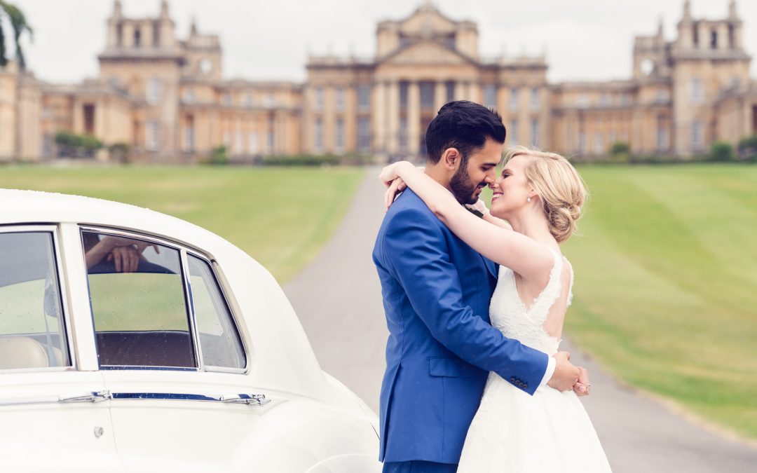 A bride and groom embrace and smile at each other beside a white vintage car, with a grand historic building and spacious grounds in the background.
