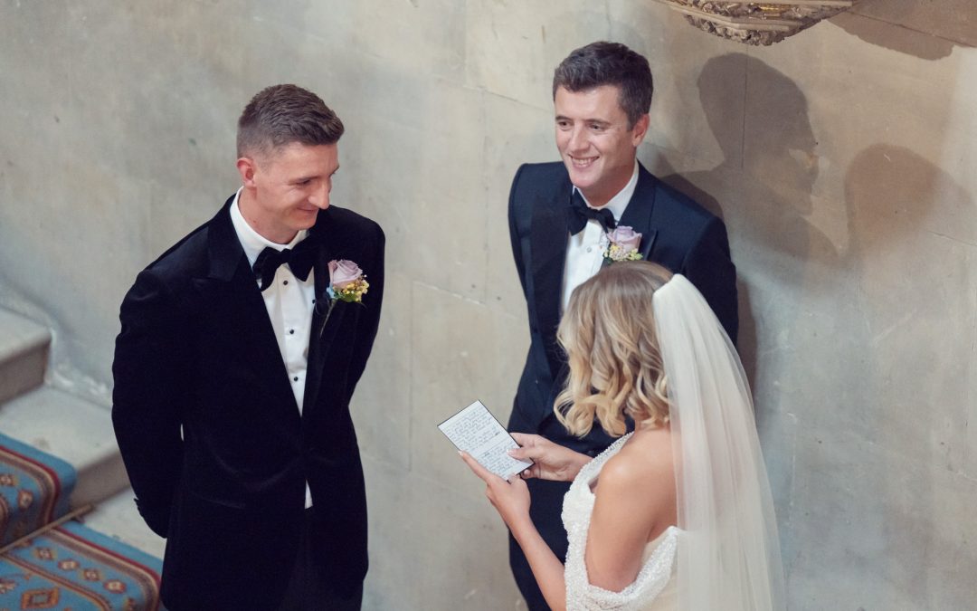 A bride in a white dress and veil reads vows from a note to two men in tuxedos with buttonholes, standing on a staircase with patterned carpet and a stone wall background.