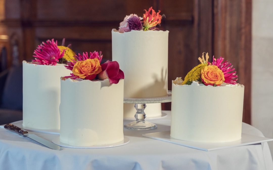 Four white frosted cakes, each topped with colourful flowers, are arranged on a round table covered with a white tablecloth. One cake is elevated on a glass stand. A cake knife is placed nearby.